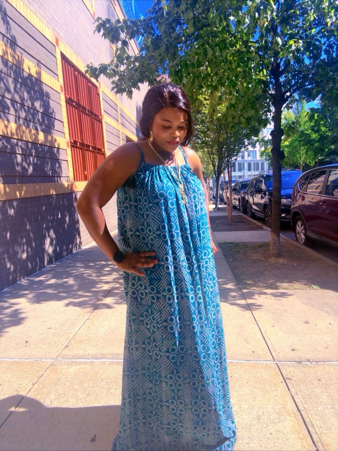 Stay cool, chic, and effortlessly stylish in this blue Ankara maxi dress. Designed with a lightweight sleeveless cut and a flowy floor-length silhouette, this dress combines comfort with elegance. The geometric Ankara patterns add a modern touch, making it the perfect choice for summer outings, casual gatherings, and vacation wear.